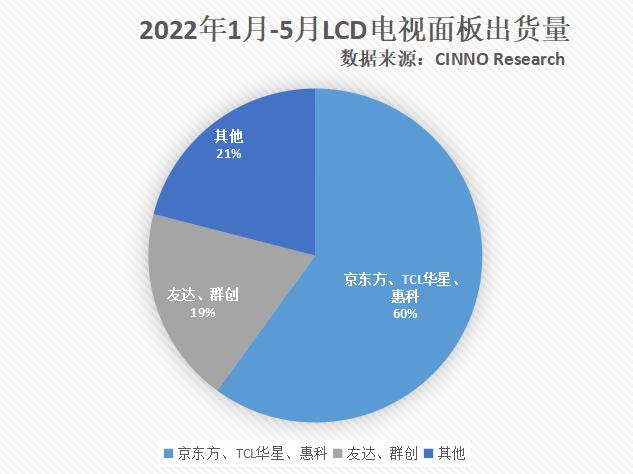 劉雨實分析說,以TV面板為例,近年來隨著友商成長,友達和群創出貨量已滑落至第二梯隊。根據CINNO Research數據,2022年1月-5月LCD 電視面板出貨量中,京東方、TCL華星、惠科合計達60%,友達和群創合計約為19%,若是考慮到兩家企業出貨尺寸普遍偏小,出貨面積差距還要更大。