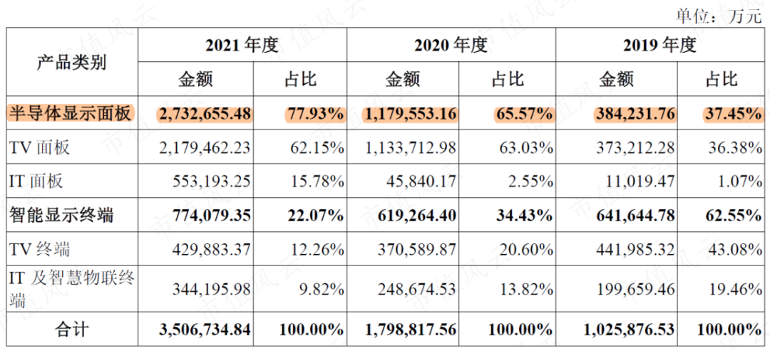 受益于此,惠科股份半導(dǎo)體顯示面板業(yè)務(wù)的收入大增,在2020年超越智能顯示終端業(yè)務(wù),并在2021年形成絕對優(yōu)勢。