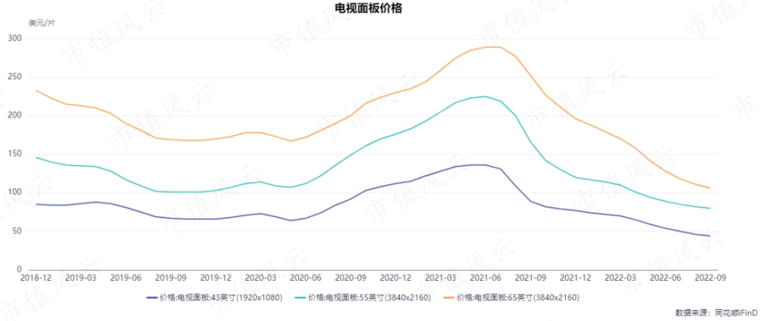 然而此輪周期已在2021年中見頂,2021年下半年至今,面板價格一路下跌,到2022年中期甚至跌出2019年以來的新低。