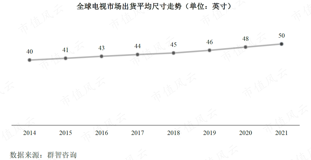 受消費升級及技術(shù)革新拉動,全球電視大尺寸趨勢明顯。2020年、2021年,全球電視市場出貨平均尺寸,同比均增加了2英寸。