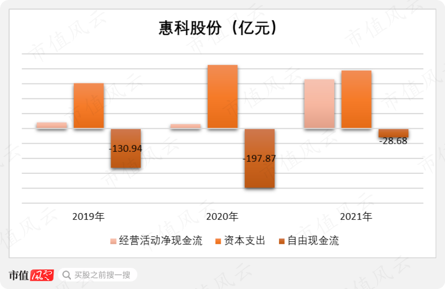 而在業(yè)績低迷的2019年、2020年,經(jīng)營活動凈現(xiàn)金流與資本支出之間就更懸殊了。2019-2021年,惠科股份合計資本支出高達(dá)558億元。