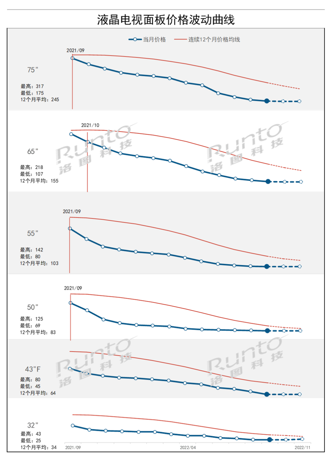 --9月液晶電視面板的個別尺寸價格基本維持或微幅下降狀態,大尺寸仍在下降,繼續刷新過去12個月的最低值,也開始觸碰到敏感水位。