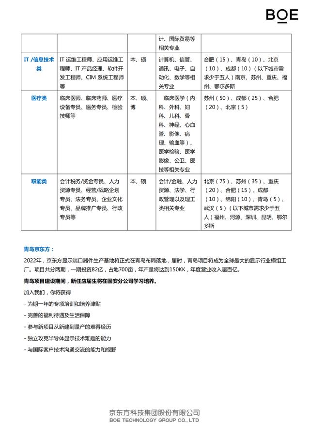 京東方(青島)智慧系統創新中心項目早在2019年就在青島簽約了,如今終于迎來了新進展,京東方日前發布了一條就青島京東方招聘的啟事讓整個項目又向前邁了一步。京東方招聘啟事中提出:“2022年,京東方顯示端口器件生產基地,將正式在青島布局落地,屆時,青島項目將成為全球最大的顯示行業模組工廠,該項目將分兩期,一期投資82億,年產量達150KK,年營業將超百億。”