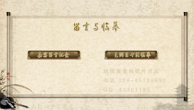 電子簽名系統軟件主要是針對嘉賓留言與臨摹書法這兩部分組成。整個界面背景呈現一種古色古香的書卷氣息。展開的畫軸,精致的兩個古典按鈕并排排列。