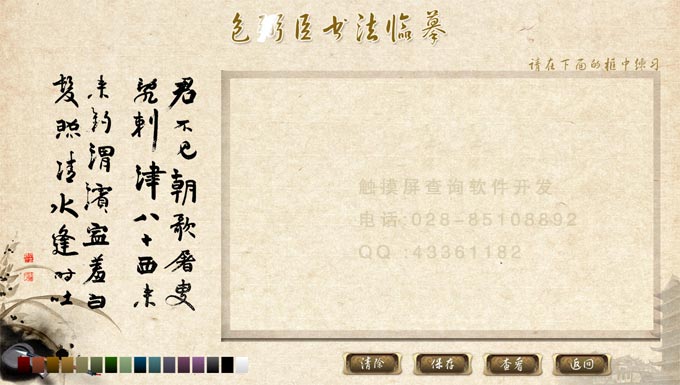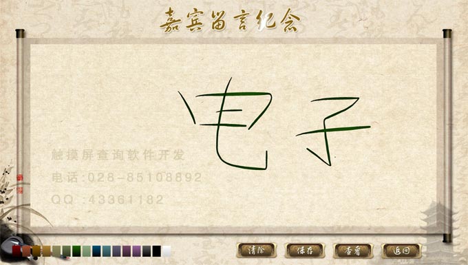 用手觸摸界面上的“嘉賓留言紀念”按鈕,即可進入相應的頁面。在這個頁面,仍然是一張展開的畫軸為主。此頁面主要分為4個區域版塊。醒目的嘉賓留言紀念字幕為一個版塊。畫軸占據頁面的中間主要位置為第二版塊,在這個版塊嘉賓可以進行簽名留言,只需要使用手指,在觸摸屏上面輕輕的書寫即可。頁面的左下角提供了顏色選擇,你可以選擇你喜歡的任意顏色,右下角并排的幾個按鈕都有相應的功能。觸摸清除按鈕,既可以立即清除你剛才書寫的內容,不僅可以對你書寫的內容進行保存,還可以進行查看。此觸摸屏電子簽名軟件還有一個特別的功能,即你書寫的文字會有筆鋒的變化,是不是覺得非常的神奇呢?